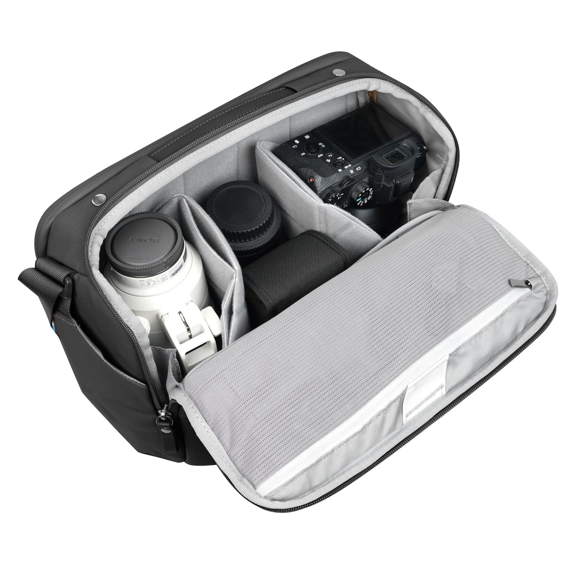 The camera compartment allows you to carry a full-frame camera with up to 3 lenses (up to 24-70mm f2.8), or a small drone, separated by slimline EVA dividers that are designed to maximize the space available while protecting your gear. You can adjust the dividers to your preferred layout or remove them to create an everyday shoulder bag. Enjoy full access to the camera compartment through the top of the bag, which opens away from the body for maximum security.